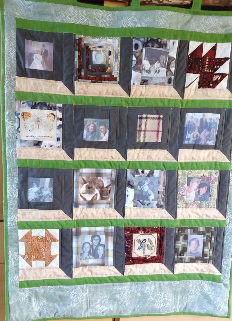 Quilt van mijn leven. Met foto's op stof gedrukt, dierbare borduurwerkjes, stukje stof van mijn