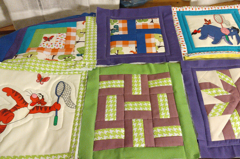 Een boxkleed in wording. Winny the Pooh figuren uit n oud dekbedhoesje.