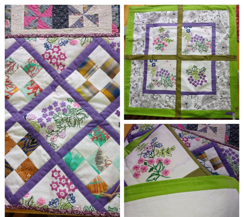 Wat je kunt doen met een oud geborduurd tafellaken, aangevuld met andere gerecyclede stof (bv oude lakens). De achterkant is een oude babymolton.
